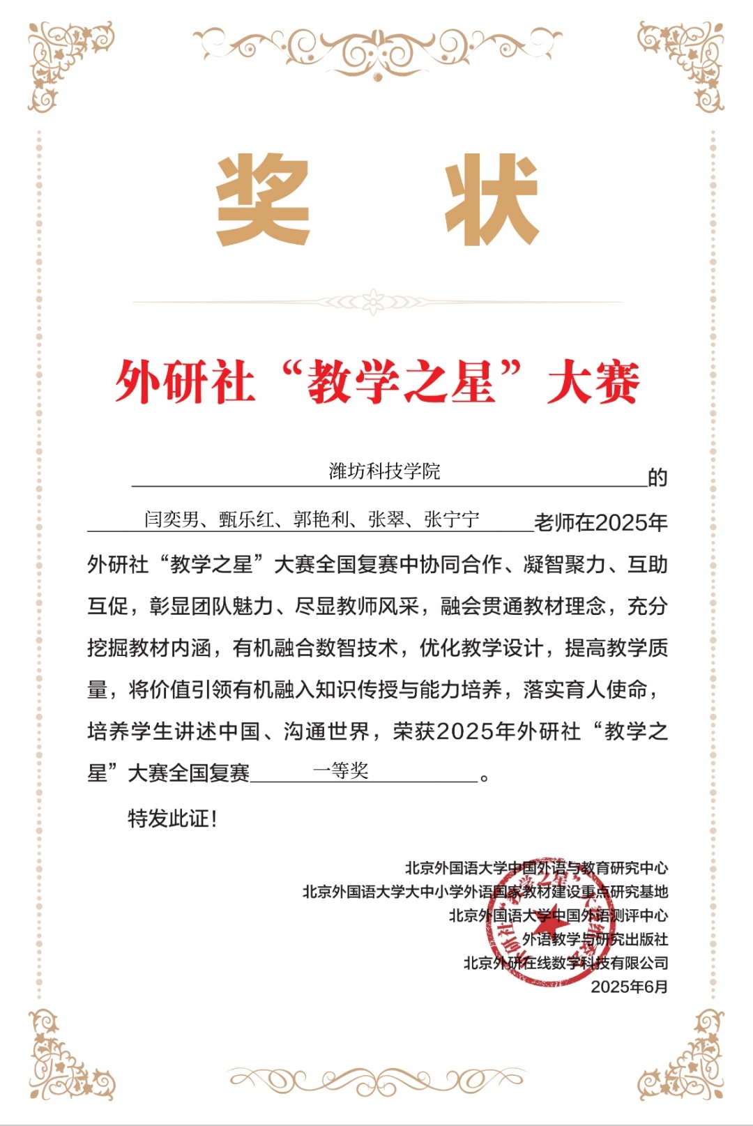 2025年外研社“教学之星”大赛主题为“外语教材的有效使用:讲述中国,沟通世界”。此次获奖充分展示了近年来suncitygroup太阳新城在推动外语教学改革与课程建设,强化课程思政、数字赋能和创新育人方面取得的重要突破,也生动呈现了团队教师在“讲述中国,沟通世界”上的教学实践与思考,成功架起了语言学习与文化交流的桥梁。