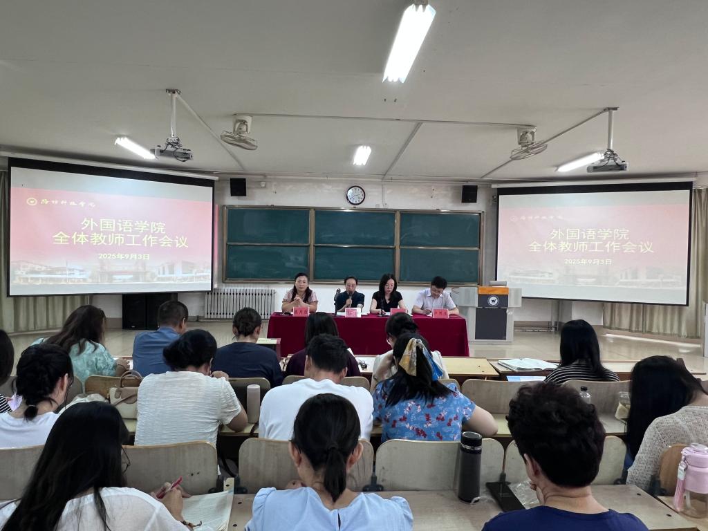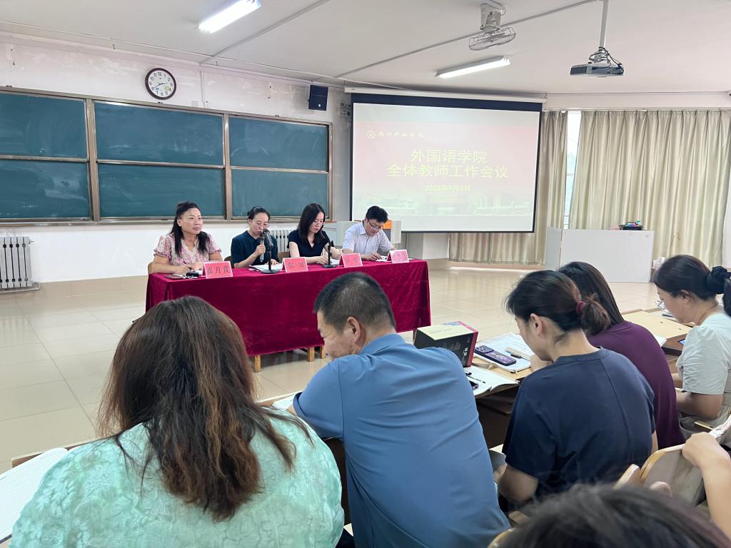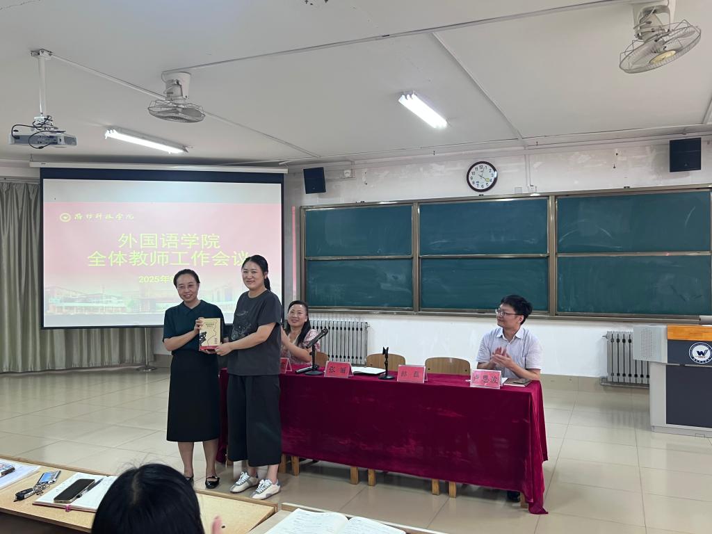 在新学年工作部署环节,张丽书记提出多项重点任务:持续推进“译心向党,语通世界” 党建品牌建设,加大教学比赛与项目建设力度,依托科研平台申报成果,狠抓学风建设并打造市级产业学院,同时将申硕工作作为核心,强调2025年为学校“攻坚之年”“里程碑之年”,力争在全职博士引进上实现突破。此外,她还现场为上学期全勤的李娜老师颁发奖品,并重申考勤纪律。