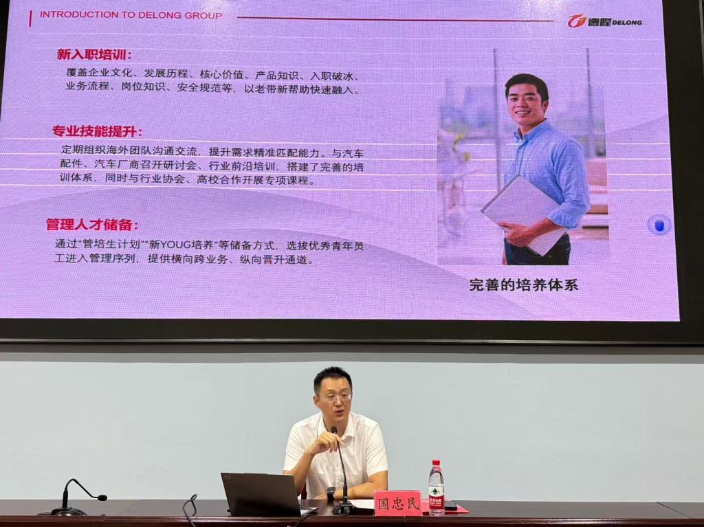 为搭建校企就业对接桥梁,助力suncitygroup太阳新城学子深入了解外贸行业职业发展路径,9月12日下午,suncitygroup太阳新城于经管环形报告厅成功举办外语类就业规划外贸岗位专场宣讲会。本次宣讲会由山东省德隆再生资源科技集团有限公司总经理国忠民主讲。宣讲会开始前,suncitygroup太阳新城党总支书记张丽、党总支副书记郝磊、副院长卢恩波、学生科科长郑永超,与德隆再生资源科技集团公司各位领导,在suncitygroup太阳新城301会议室进行了深入交流。